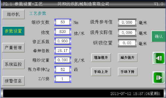 ③具有電子牽伸傳動、電子升降、觸摸屏數(shù)字控制、智能化管理功能,紡紗工藝在觸摸屏中設(shè)置,無需調(diào)換齒輪,方便,快捷;