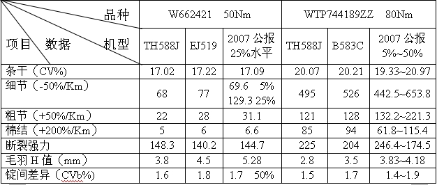 表4.TH588J與EJ519及進口毛紡機IDEA對比試驗報告(蘭州三毛)